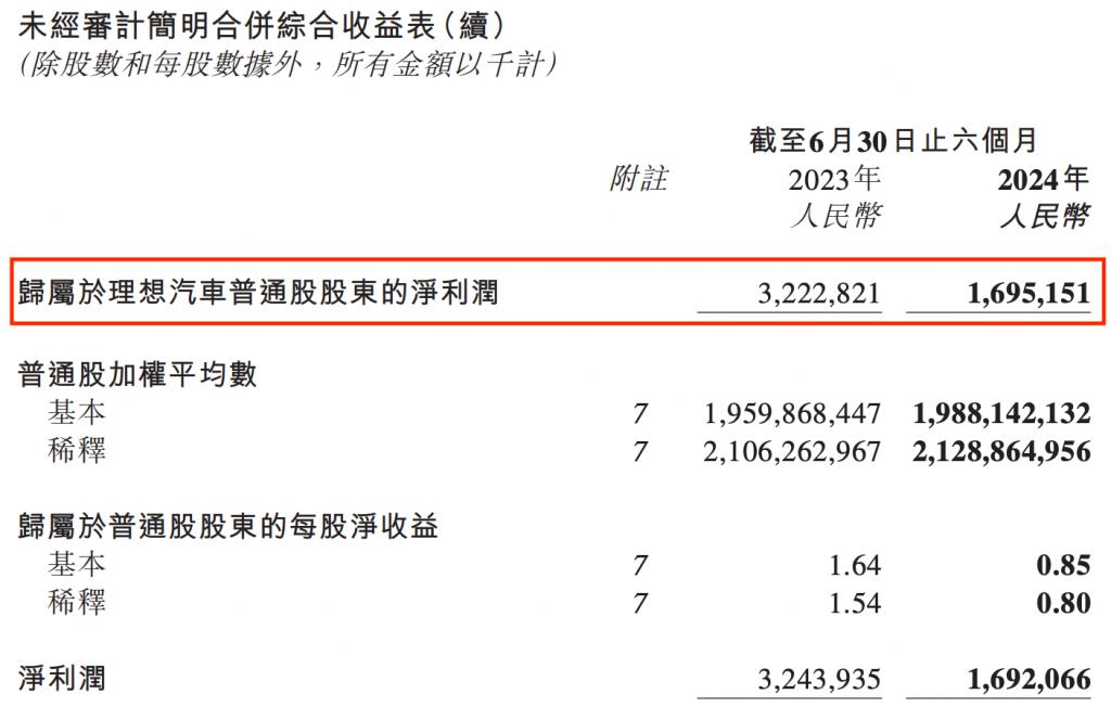 2024 上半年,理想汽车归母净利润 16.95 亿元,较去年同期减少 15.28 亿元,同比下滑 47.4%,近乎腰斩。