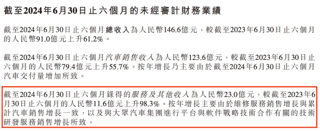 财报显示,小鹏汽车上半年录得服务及其他收入 22.96 亿元,同比增长 98.3%。