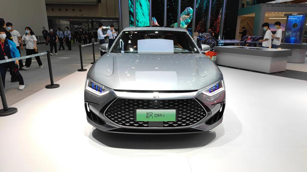 外观方面,新车继续采用现款 "Dragon Face" 设计理念,但 DM-i 版车型前脸取消了大嘴式格栅,取而代之的是封闭式进气格栅,视觉效果上更大气。新车两侧狭长的 LED 头灯组由一条镀铬饰条相互衔接,整体辨识度极高。并对前包围进气与散热口部分进行黑化处理,彰显运动性。此外,新车最大的变化是车顶可选装激光雷达。