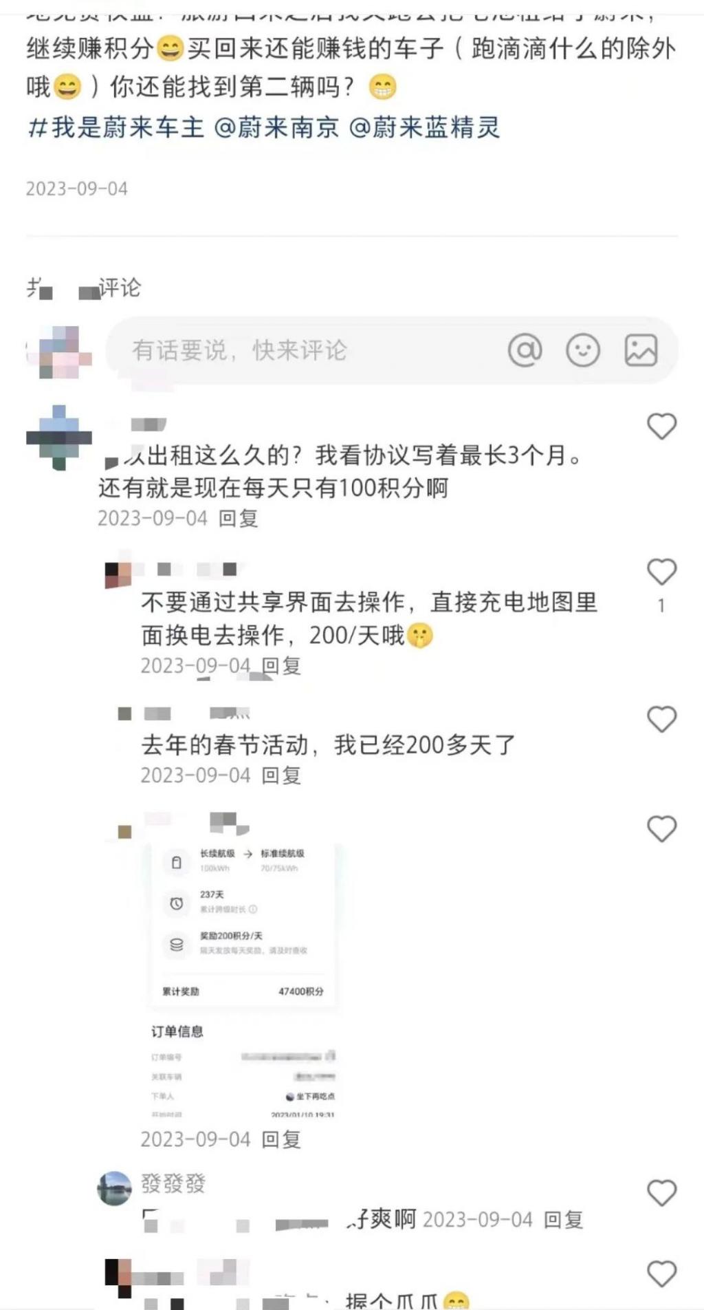 甚至有车主共享了 237 天,赚了 47400 积分。。。而蔚来大电池与小电池现在的价差是 58000 元,这么算下来 8 年后就可以反向赚钱,这还没算偶尔的特别活动,真绝了。