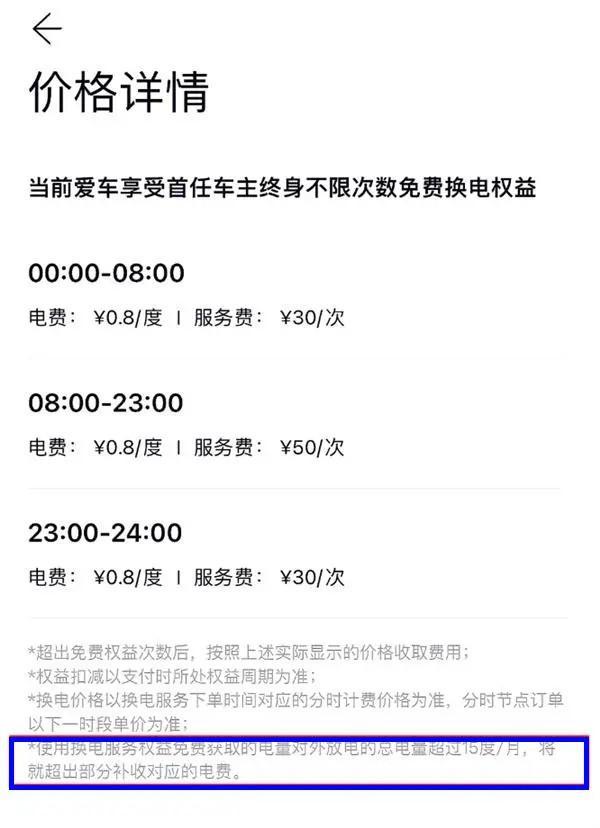 去年 11 月,蔚来修改了换电细则,这个月使用换电服务后,最多外放电 15 度,超出的部分需要进行额外收费。