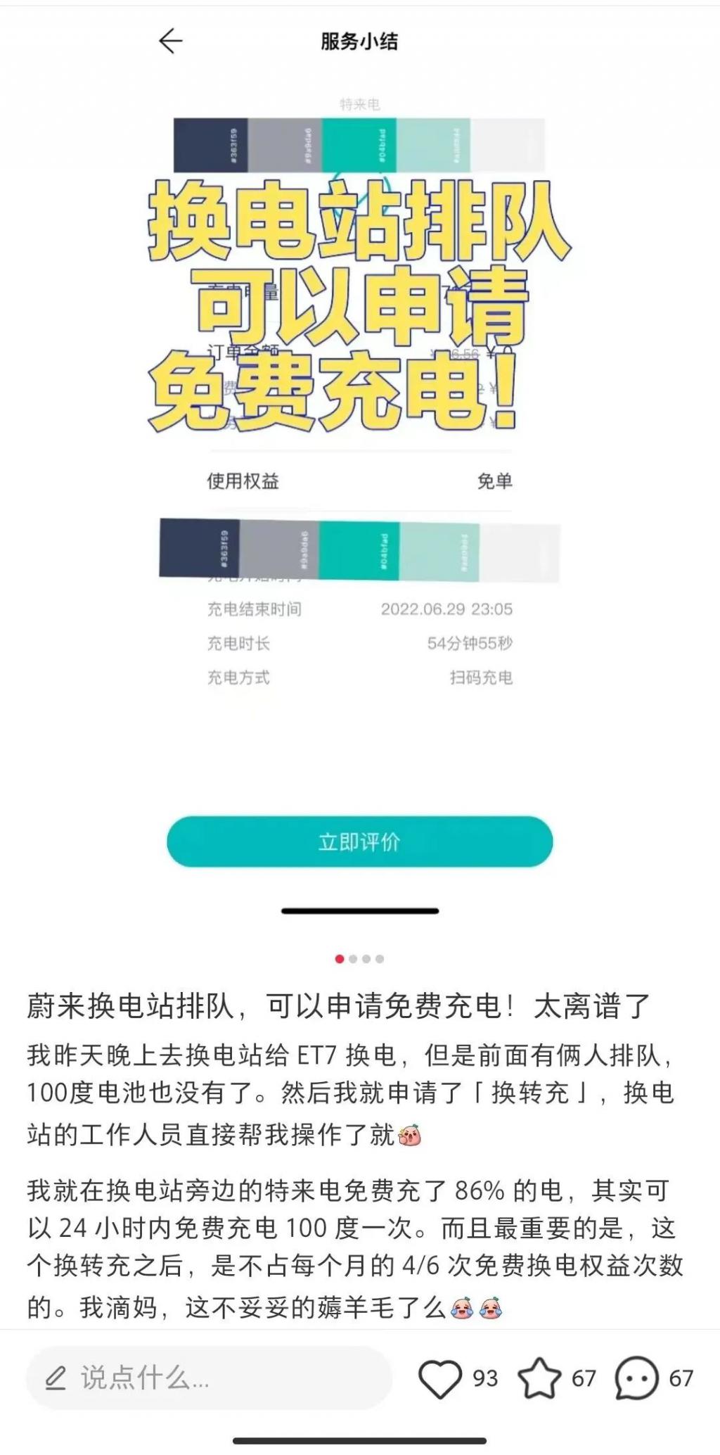 除了电池共享这个手段,羊毛党还薅了一波蔚来的免费换电权益。