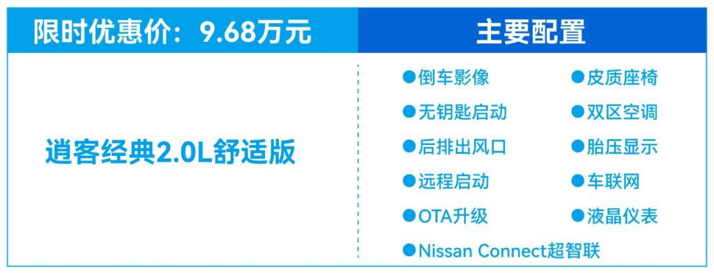 很多人对合资车的第一印象就是:配置低。不过,深耕中国市场多年,东风日产对国人的喜好拿捏得日渐到位。比如此次推出限时优惠的逍客经典 2.0L 舒适版,不但价格低至 9.68 万元起,直接对小型 SUV 进行降维打击。更难得的是,逍客入门即配齐,将诚意拉满了。