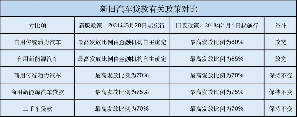 根据《通知》内容,商用传统动力汽车、商用新能源汽车、二手车贷款的最高发放比例维持不变,但取消了金融机构对自用传统动力汽车、自用新能源汽车 80% 和 85% 的贷款最高发放比例限制。也就是说,今后贷款金额可按所购汽车价格全额发放,贷款比例最高可达 100%。