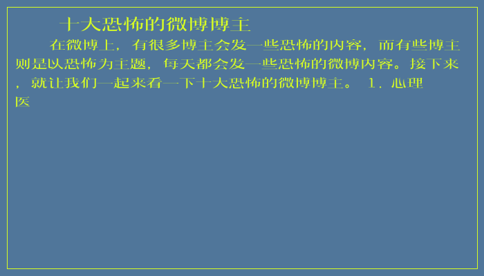 在微博上,有很多博主会发一些恐怖的内容,而有些博主则是以恐怖为主题,每天都会发一些恐怖的微博内容。接下来,就让我们一起来看一下十大恐怖的微博博主。