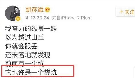 在郑爽爸爸答复网友发问含糊胡彦斌没有是其半子之后,胡彦斌发了一条表示深长的微专,本话如上图所示。网友猜测胡彦斌简直暗讽郑爽父子是“粪坑”,让许多网友大跌眼镜,然而这也不过网友们脑洞大启的的猜测,有人感触是有感而发罢了,大概者也大概是歌词汇(大概性极小),也有人认为是在表白怨恨,怨恨郑爽父女连交拿分别炒作。没有论怎样样,郑爽父亲既然说这是陈年旧事,证明二人真简直所有过,然而厥后真实也分别了。