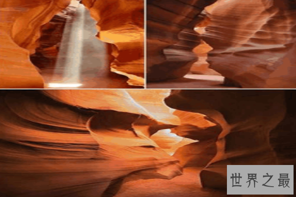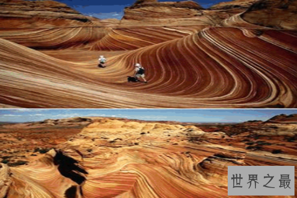 第一大地貌奇观是位于美国犹他州和亚利桑那州交界处的波纹岩,这是一块岩石状的地质,也是由沙丘演变而成的岩石结构,在波纹岩的表面上有黑色灰色和咖啡色的条纹。