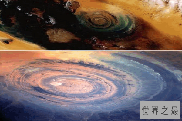 第三大地貌奇观位于毛里塔尼亚被称作是撒哈拉之眼,它最初被人们认为是一个陨石坑,但是因为中心地势平坦,没有火山堆积的形状,所以科学家们认为是地形抬升侵蚀的结果。