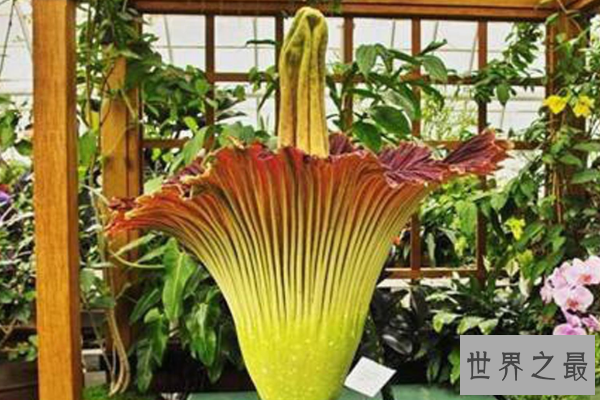 巨花魔芋,也就是巨魔芋,它的块茎直径可达65厘米,最重可超过100千克。它开出的花又大又好看,非常艳丽,观赏价值很高,但是会散发出一股刺鼻的尸臭味。