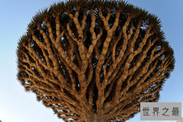 龙血树,树干短粗,表面为浅褐色,较粗糙,能抽出很多短小粗壮的树枝。树液深红色。叶蓝绿色,每片叶子长60厘米,宽5厘米,开出的花比较小,颜色为白绿色。从其木质部提取出来的血竭可药用。