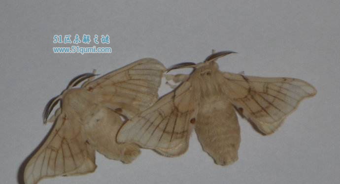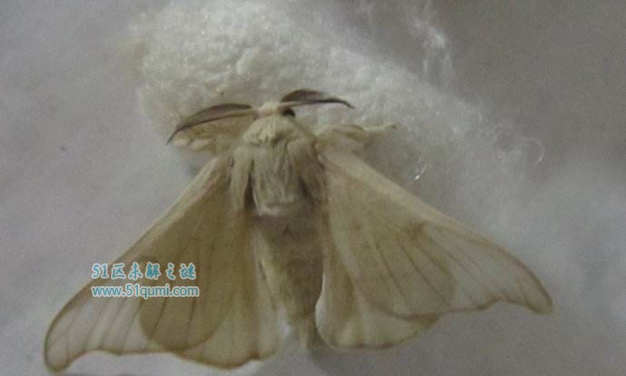蚕蛾的外形像蝴蝶,浑身披着白色鳞毛,但是因为二对于翅较小,已遗失翱翔本领。蚕蛾的头部呈小球状,长有饱起的复眼和触角;胸部长有一双于胸脚及二对于翅;腹部已无腹脚,终局体节衍化为外生殖器。雌蛾体大,蠕动缓;雄蛾体小,蠕动较快,党羽赶快地振荡,寻觅着夫妇。普遍接尾3~4小时后,雌蛾便可产下受精卵。蚕蛾留住后裔,没有久之后便会死去。蚕蛾产下的卵→孵蚕→变蛹→化蛾,又将完毕新一代的轮回。这便是蚕的性命史。
