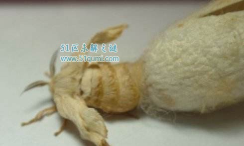 幼虫即家蚕,圆筒形,灰白色,有暗色花纹,理想疏生黄褐色短毛,除头部外,由13个关节构成,头小而脆硬,有单眼,触角,唇,颚及吐丝管。前3节为胸部,后10节为腹部。前胸节甚小,二侧有椭圆形的气门,中、后胸节膨胀,表面有皱襞。胸脚3对于,腹脚4对于,尾脚1对于。第8节背后中yang有尾角1枚。体内有丝腺,能渗透丝质,吐丝作茧。