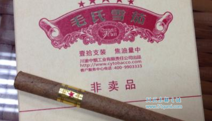 毛氏雪茄本料和工艺很佳,刺激性很小,并且它独占的参味抽起来很舒畅,回甘生津,抽多也不咳嗽,采取特制的雪茄烟叶卷制而成的,并且这种烟叶本料很罕见,所以产量高不了,普遍人都购不到。