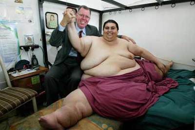 苏珊娜.埃曼,是一名来自美国亚利桑那州的妇女,目前已经育有两子,体重达725公斤,已经完全辗压世界上最胖的女人,罗莎莉.布拉德福德(最高记录544公斤,2006年已经去世)。虽然这位超巨美女有如此之重的体重,但她不怕与瘦女站在一起,对自己的身体相当骄傲,让分布各地的粉丝封她为“超大美女”。这位超巨大美女的大儿子才16岁,小儿子只有12岁,而她能有如此傲人的体重,全是靠精算卡路里而来。她与两个儿子每月都会到卖场,花8个小时补满多达六辆手推车的粮食。且她早餐吃大量肉类,午餐就开始吃冰淇淋,一天吃下超过两万卡路里......