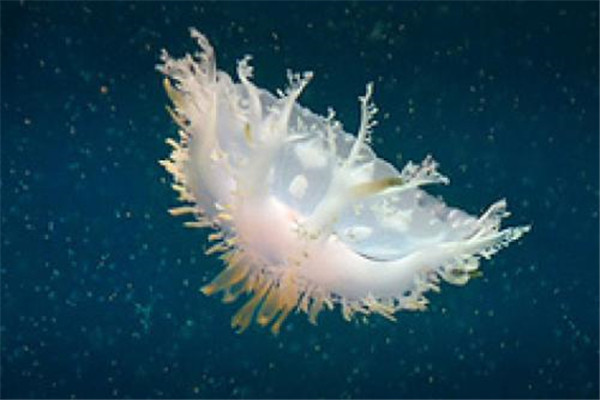 一般我们印象里面的水母,触手都是朝下的,其中像是伞一样的身体部位,则是直接朝上的,但是朝天水母却有一定的差别,那就是其中的触手是朝上的,而且这是一种车轮水母,整个呈现一种圆盘的形状,在边缘的话,还是缺少触手的,其中更是有车轮状的一个图案,这一物种还是有毒性的,其中更是会有一些黄藻类物质,呈现了花边一样的形状。