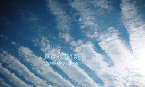 2、地动云边境清楚,此点有别于薄暮涌现的辐射状高积云,也是几条长条形云延伸接于一点。