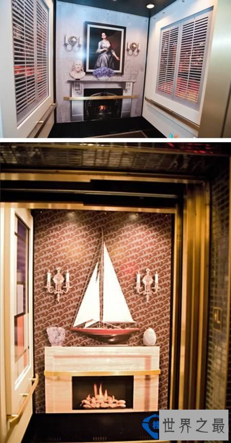 3 豪华电梯:这个电梯位于美国费城的一家酒店内,电梯里面有壁炉造景和水晶灯装饰,十分的高大上。