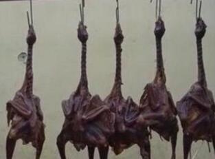 残忍禁菜风干鸡,活鸡被取内脏挂绳上风干致死
