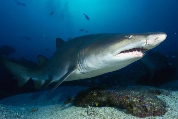 沙虎鲨是一种广大分散于大洋海岸四周的鲨鱼,经常运动于海床四周水深60-190米的场合。沙虎鲨也被称为锥齿鲨,因为它的前齿像钉子般锐利,它也是独逐一种经过吞气氛来统制身材左右湮没的鲨鱼,极为致命且猛烈。