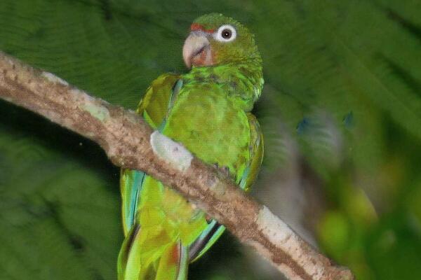波多黎各鹦鹉体型非常迷你,体长只有30厘米,尤其是脚爪更小,它们全身的羽毛都呈现绿色,和大部分的亚马逊鹦鹉类似,但波多黎各鹦鹉也有自己的独特之处,比如它的胸腹部泛着黄色,后颈部的羽毛则带有些许的黑边,额头和鸟喙处的羽毛则带有些许的红色,翅膀上的飞羽则呈现蓝色居多,最为典型的一个特征就是它的眼周围绕着一圈白色纹路。