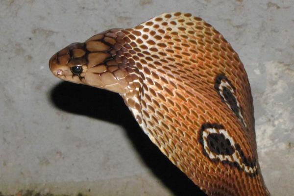 印度眼镜蛇有着极为典范的颈部扇形外皮,它们在碰到伤害的时间便会张启,和泰国眼镜蛇的鳞片脸色有着很大的分别,最先印度眼镜蛇浑身都浮现红褐色大概者黄褐色,在胸部位子则长有2-3条宽条纹,而且最为显著的是它的颈后外皮长有十分特殊的U字形白色斑纹,个中在U字的二头都长有巨大的乌点,边际被白色条纹包抄,瞅起来便像是一张浅笑的脸,但是本质上它然而十分伤害的。
