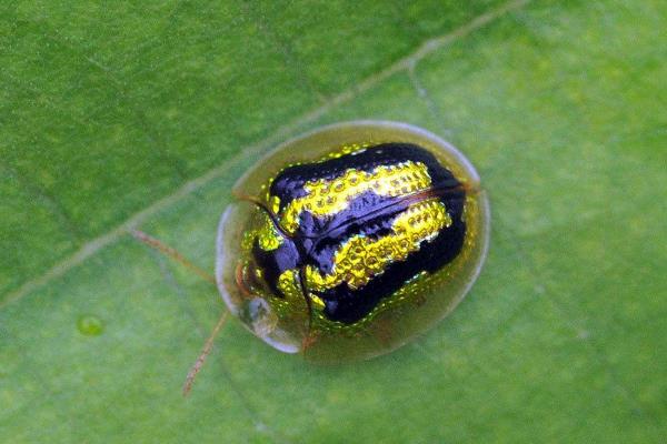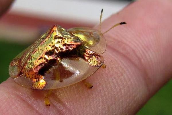 黄金龟甲虫不妨说是世界上体型最小的通明动物之一,固然它的身材大普遍时间都是红铜色的,然而是在最外层通明外壳中储躲的(水点会使得它的外壳变为金黄色,如许在本地水稻田中便能完满隐蔽本人,所以广东人也将其称为金龟子,而且它还会渗透出一种金黄色的体液,戴有必定的酸性,然而并不毒素。