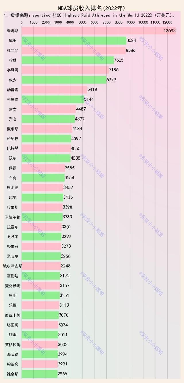 其余人收入在3千万级别,包括格里芬、维金斯、乐福、塔图姆等球星。