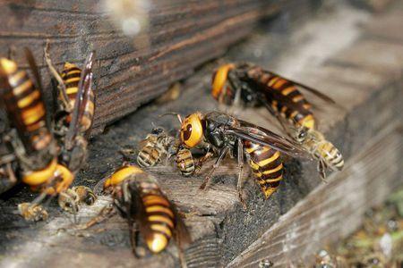 你可能认为整个蜂群都能对付一些大黄蜂,但日本大黄蜂是极其残忍和高效的杀手。只有一只黄蜂能在一分钟内杀死约40只欧洲蜜蜂。在短短几个小时内,30只黄蜂就能约3万只蜜蜂。