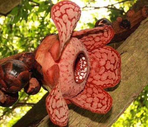 大花草,又叫大王花,盛开时整朵花可重达9千克,是迄今为止发现的最大的花。这种花的外表非常的丑陋,全身都是斑斑点点,而且这种花还会分泌很多的物质,同时这些物质都是有毒的。这种花还有一个名字就是“食人花”。大王花是寄生植物,寄生在蔓藤植物的根茎上。它自己既无根,又无叶,也无茎,一生只开一朵花。让我们来看看大王花的生长过程吧。大花草的种子找到了适宜生长的蔓藤植物后就附着在上面,起初只能看到被寄生的部位开裂,后来便可见到开裂处有一个小包。小包一天天长大,九个月后就变成一朵大的“卷心菜”开放了原来紧包着的“叶子”向四面舒展开来,就成了那五片肉质的花瓣。