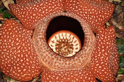 人们称这种气味为恶臭。这种花都有瓣花瓣,而且每一瓣花瓣的厚度可以达到米,整体身上布满了各种大小不一样的白色的点点,这些白色的点是平滑的,随机的分布在大王花的外表。整个花的中间有一个很大的凹陷的地方,里面分布着类似于牙齿的锋利的白的器官。