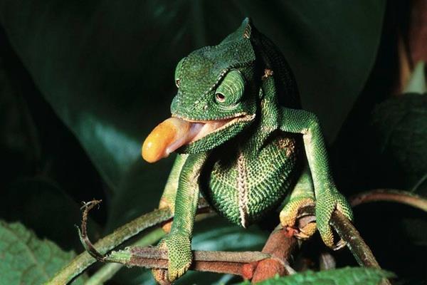 变色龙作为一种爬行动物,它的天敌可能来自空中的猛禽,也有可能是枝头缠绕的毒蛇,生性喜静的变色龙天生行动缓慢喜欢呆在枝头,变色龙在不受惊的情况下,还是可以被发现的,不过在受到来自天敌的威胁后,变色龙便会迅速改变自身颜色,融入周围环境之中迷惑天敌,进而逃过猎捕。