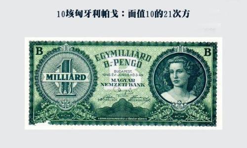 匈牙利帕戈在第二次世界大战后失去价值,[bai]遭受到纪录上有史以来最严重的货币贬值,物价飞涨到了无法控制的地步,计价时需要用到极高的位数,面值10垓帕戈的钞票,旧匈牙利的钞票,面值是100,000,000,000,000,000,000,也就是10的21次方帕戈,有印出但是没有发行,成为历史上最高面额的未发行钞票。发行的钞票中面值最高的为1垓帕戈(10的20次方),成为历史上最高面额的已发行钞票推荐。如果兑换成美元,如此惊人面额也不过20美分左右。