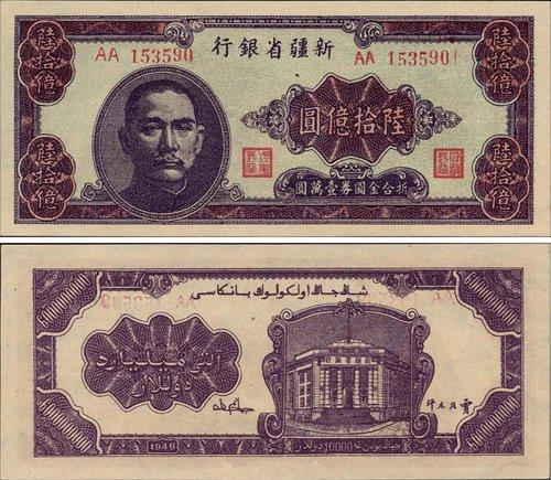 中国货币史上最大面额的纸币原文。一张面值“六十亿”元的金元券,那是30年代中期,国民党政府统治时期新疆省发行的一枚金元券,因为国务党政府滥发纸币,组成了庞大的垄断金融体系“四行两局”,造成恶性通货膨胀,这60亿面值的金元券实际面值折合成金元券只有1万元,在当时的上海市场上只能买到70粒大米。