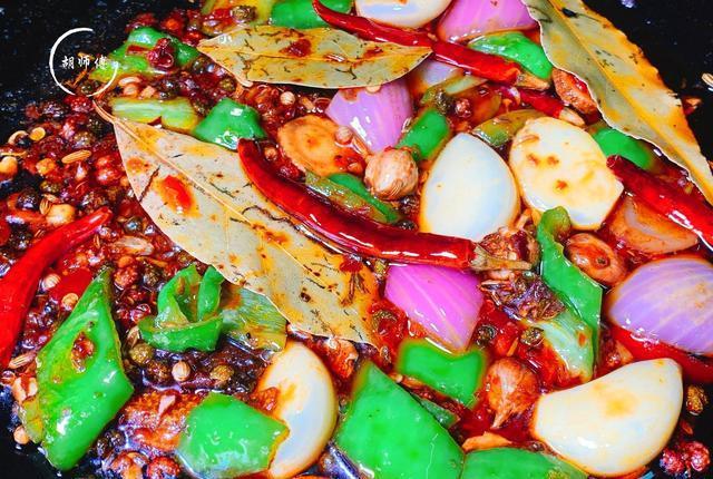 第四步:另起一锅,将锅烧热后放入适量的油,将油烧到5成热时,将白豆蔻、小茴香、香叶、甘草、香菜籽、干辣椒、花椒、青椒、洋葱、蒜瓣、姜末、辣酱全部放入到锅中小火炒2分钟。