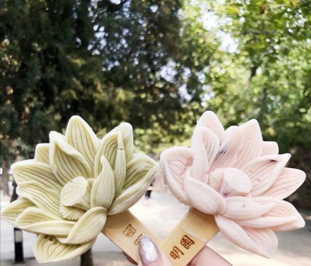 圆明园荷花雪糕圆明园新推出了一款雪糕——荷花雪糕,是被圆明园的荷花景点启发的创意,这种荷花雪糕看起来惟妙惟肖,每一片花瓣都栩栩如生。除了荷花味道之外,还有香草味道,朗姆提子味,开心果味和玫瑰花味道等等。不价格小贵,一个要15块钱。