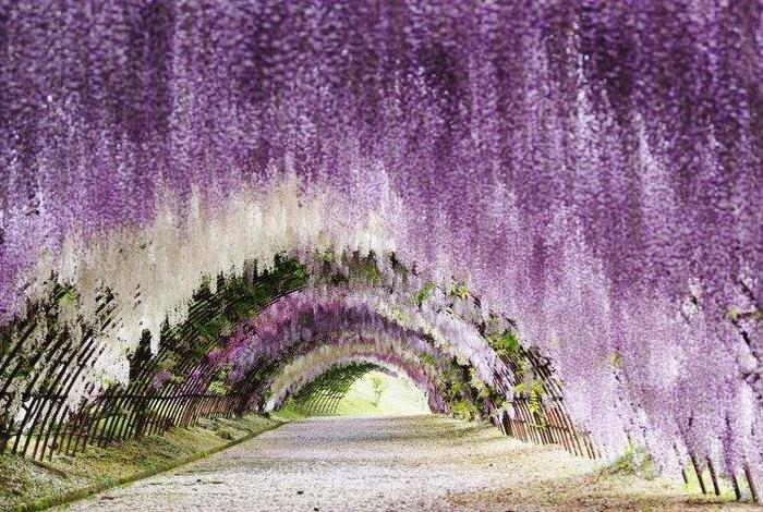 在北九州市的河内藤园,清新柔美的紫藤隧道让此地名声大噪。