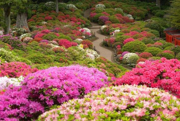 在东京城内,同样以杜鹃花闻名的根津神社每年都会举办杜鹃花祭,身着和服的游客穿梭在上百个品种的杜鹃花之间,你还能在这里看见黑色的杜鹃。