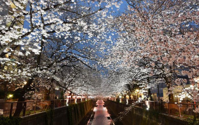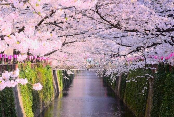 东京中目黑区的目黑川沿岸是远近闻名的赏樱胜地,狭窄的河道边种满了樱花树,落樱随水漂流,极尽浪漫。