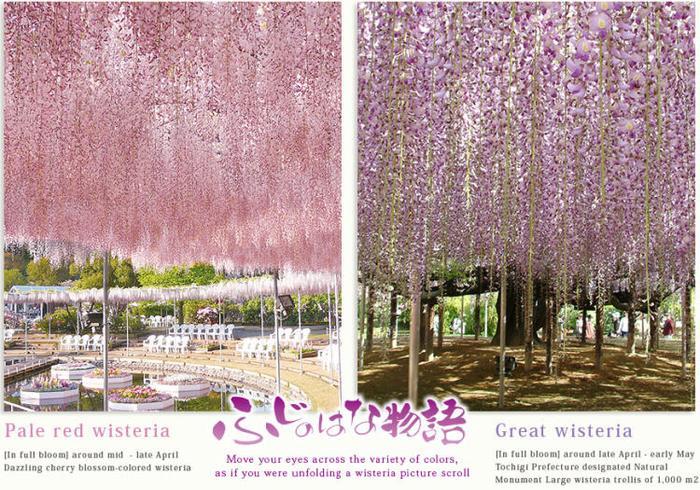 距离东京不到两小时车程的足利花卉公园也能看见紫藤、白藤、粉藤、黄藤等各种颜色的藤花。/足利花卉公园官网