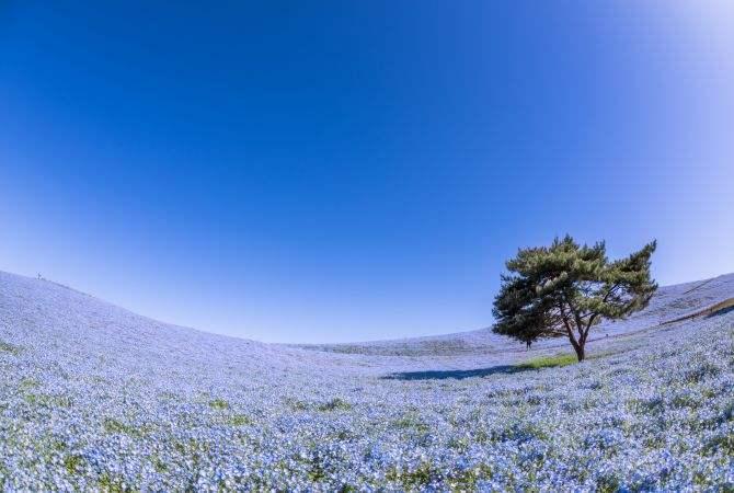 在距离东京不远的茨城县,无数人追逐蓝色而来。国营常陆海滨公园里,荧蓝色的粉蝶花遍布山丘,与蔚蓝的大海遥相呼应。