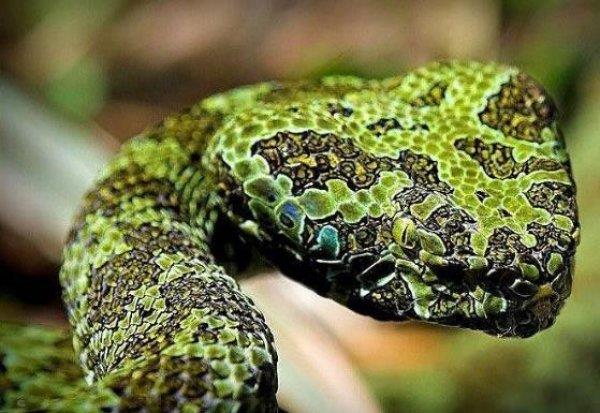 莽山烙铁头是我国独有的毒蛇品种,也是国家特级保护动物,十分稀有。莽山烙铁头的外表看起来是很“恶心”的,其浑身都是黑绿相间的花纹,尾巴却是一样的青绿色。此外,莽山烙铁头的毒性也是很强大,能一次性释放大量的毒液。莽山烙铁头蛇全长可达到2米以上,是已知的毒蛇类里的最大型蛇种,已经发现的莽山烙铁头蛇活体,最重的为8.5千克。