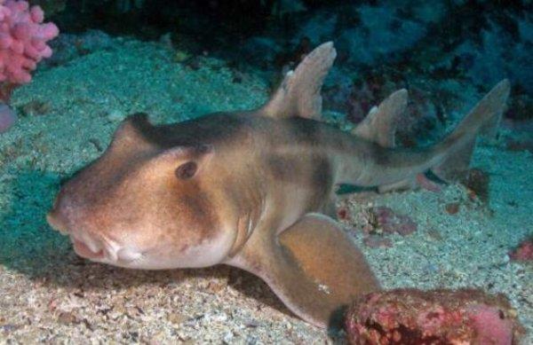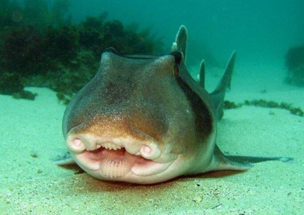 澳大利亚虎鲨就像是个大头娃娃一样,头的比例很大,前额突出,也就导致了澳大利亚虎鲨的尾巴只能朝下而且没有分锋利的牙齿,所以澳大利亚虎鲨不能像一般的虎鲨一样轻易将猎物撕裂,而且连稍大点的猎物都吃不了。所以澳大利亚虎鲨只能猎一下小型的鱼类,或者像贝壳一样的生物。