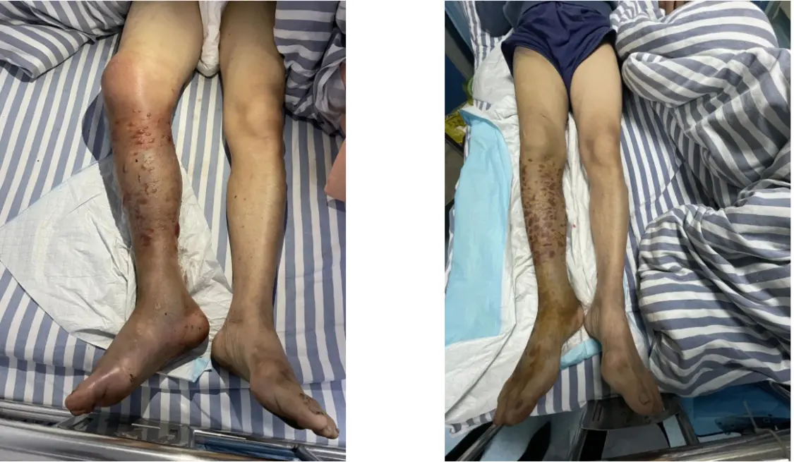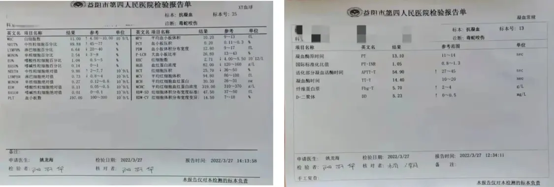入院时,李李爷爷已经被蛇咬伤4个多小时了,老人面色苍白、呼吸急促,右腿重度浮肿,布满血疱,局部有小片发黑,伤口仍流血不止,曾刘婧副主任医师立即对病人进行生命体征监测,伤口处理,注射蛇毒血清,抽血检查等一系列救治措施,在医生、护士的精心治疗护理下,2小时候后大爷神志逐渐恢复,恶心呕吐停止,头晕眼花逐逐步缓解,复查各项重要指标明显好转后。