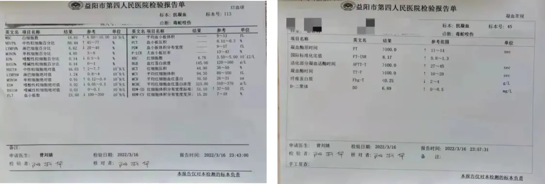 近日,家住安化县羊角塘镇九龙村年过六旬的李爷爷上山砍柴时被一条五步蛇咬到了右腿脚踝处,请来当地知名土蛇医救治,蛇医用嘴吸允伤口后,再取来一碗打碎,用碎片划开了大爷的伤口,准备排毒敷草药,不料划开的伤口随即流血不止,且头晕眼花加重,并出现恶心呕吐,意识逐渐模糊,大小便失禁,经邻居介绍,急忙驱车百余公里送来益阳市第四人民医院动物咬伤救治中心进行治疗。