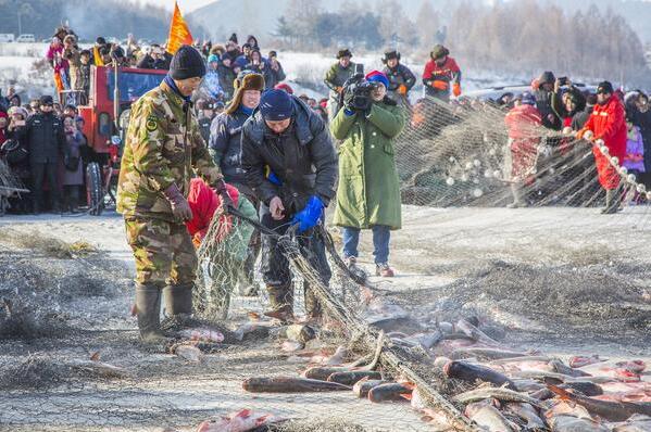 在冰雪渔猎文化旅游节前后几天中每天都会开冰捕鱼,在每网收获的数万斤的鱼中,最重的那只鱼就被称为当天的头鱼。最终会在每天的头鱼当中挑选出最终的头鱼来进行拍卖。