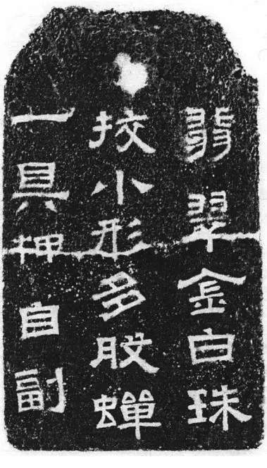 有三枚石签牌记用翡翠(彩石、白珠和金珠相绞成蝉,还有一枚记黑介帻其所指即《舆服杂注》载通天冠高九寸,黑介帻,金博山,是天子之冠。