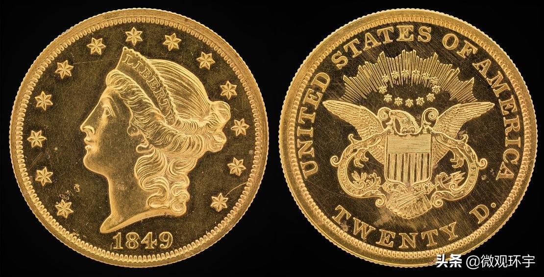 这一枚1849年的金币是美国历史上第一枚双鹰币。尽管这枚钱币从技术上来说只是一枚样币,或者说是试验币,但是它是美国铸币中最为珍稀的钱币之一。人们于1848年在加利福尼亚发现了金矿,之后大量黄金流向美国东岸。许多人认为1849年双鹰硬币是美国历史上最有价值的硬币,目前价值 2000 万美元,可以肯定地说,1849 双鹰硬币是世界上最稀有的硬币。(其实与1933年双鹰币相比,到底哪个值钱,也是见仁见智)