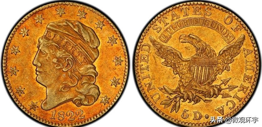 1822年发行的半鹰币面额为5美元,最初铸造了17796件,但目前幸存的只有3件。其中2件保存在史密森学会,另一件则是私人所有。有人判断说如果将这枚金币出售,它可以卖到1000万美元。