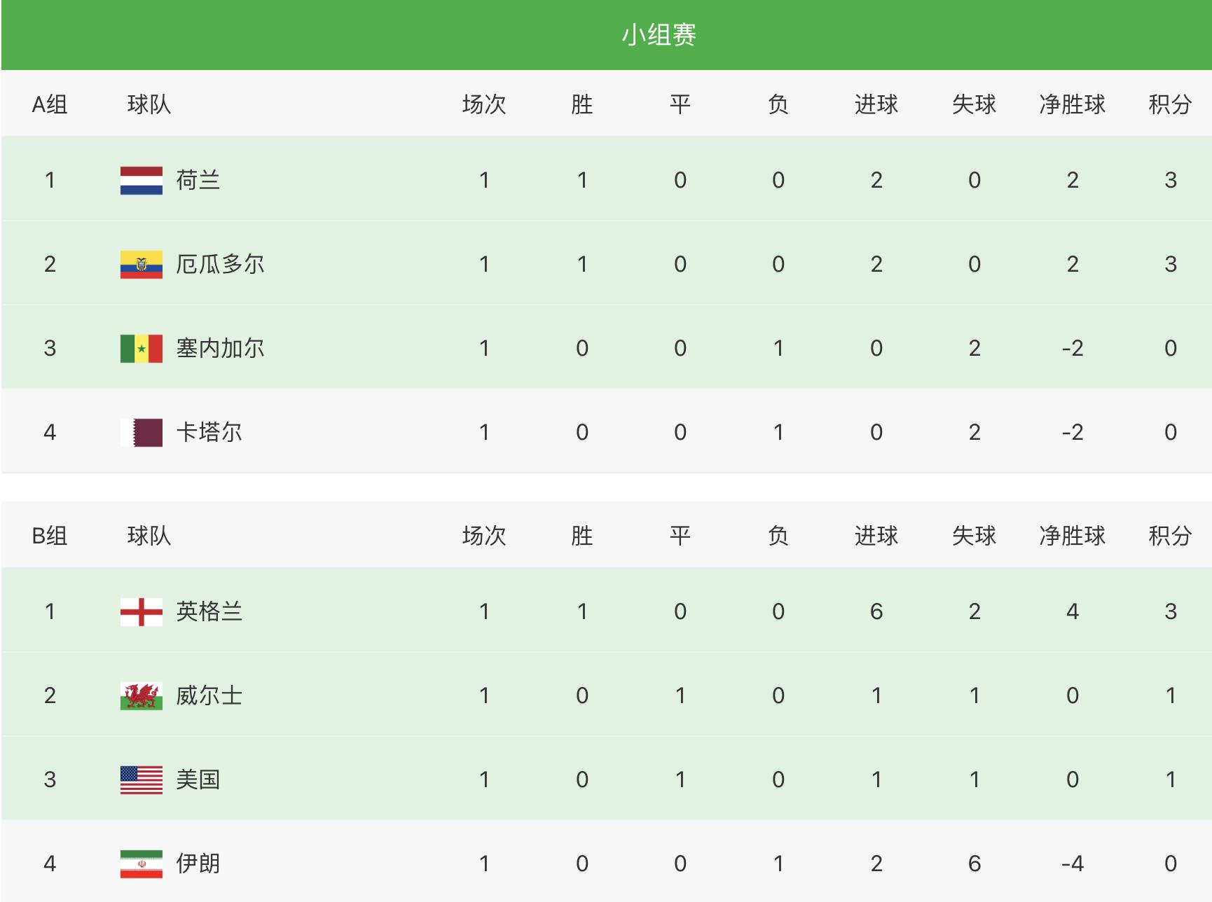从11月21日开赛到现在,目前abcd四个小组第一轮比赛都结束了,a小组里,东道主卡塔尔首场比赛0-2输给厄瓜多尔,同组另外一场比赛,荷兰队跟塞内加尔苦战84分钟,随后通过一波10分钟2球的攻击波,2-0艰难拿下塞内加尔。目前a小组荷兰队和厄瓜多尔队都是3分,卡塔尔跟塞内加尔0分。