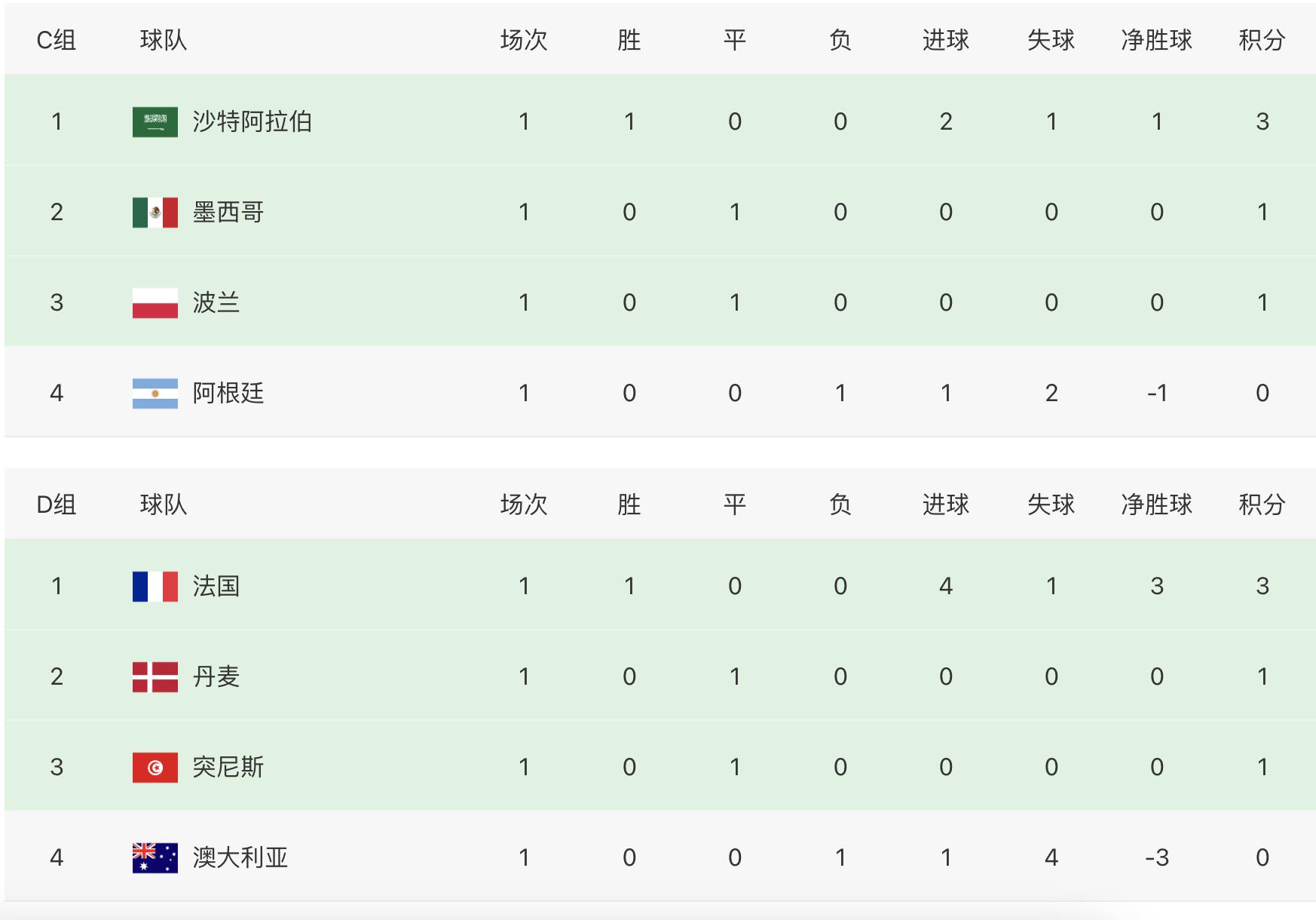 d小组里,卫冕冠军法国队首轮对阵澳大利亚,在先丢一球的情况下,法国队连下四城逆转比分,4-1轻取澳大利亚拿到开门红,而另外一场比赛,丹麦跟突尼斯激战90分钟,最终是0-0握手言和,目前法国队3分小组第一,丹麦跟突尼斯都是1分,澳大利亚0分垫底。